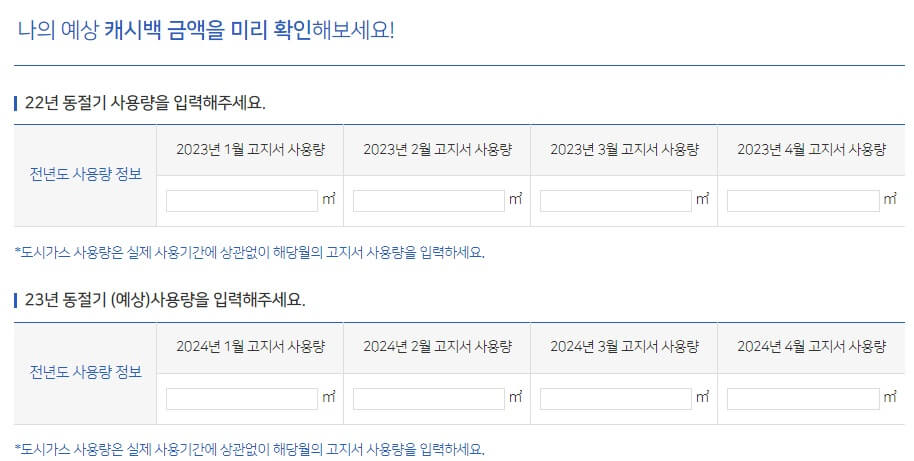 22년과 23년 동절기 사용량을 확인해 입력해 주면 캐시백 금액을 알 수 있으니 바로 확인해 보시기 바랍니다.