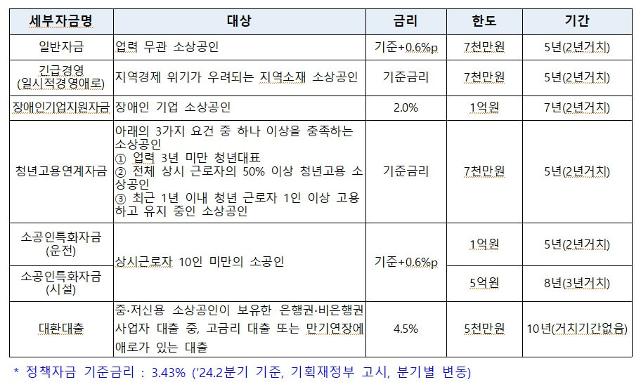 자금별 별도로 한도 및 기간을 제공하고 있으며, 아래 표를 확인하시기 바랍니다.