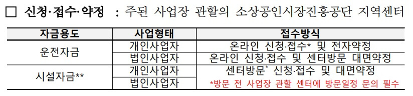 신청방법은 총 2가이며 운전자금은 온라인으로, 시설자금은 센터방문만 가능합니다.